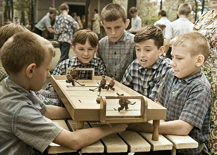 Дети играют в настольный хоккей в детском городке Центрального парка культуры и отдыха имени М. Горького. Москва, 1963 год.