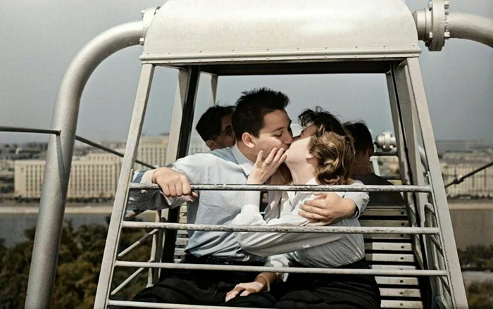 Поцелуй в верхней точке колеса обозрения в Центральном парке культуры и отдыха им. М. Горького. Москва, 1959 год.
