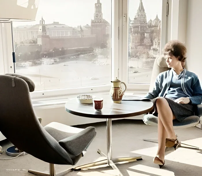 На снимке можно заметить вещи, которые были практически у всех в квартирах: жостовский поднос, китайские термосы и модный абажур.