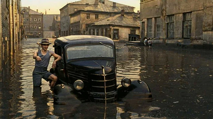Наводнение в Курсовом переулке после грозовых ливней в мае. Москва, 1949 год.