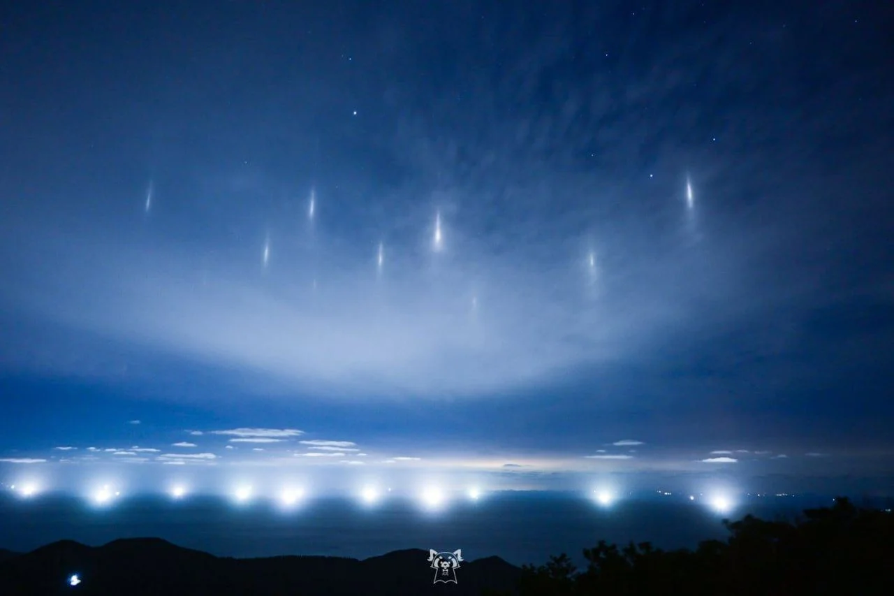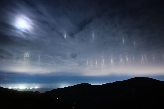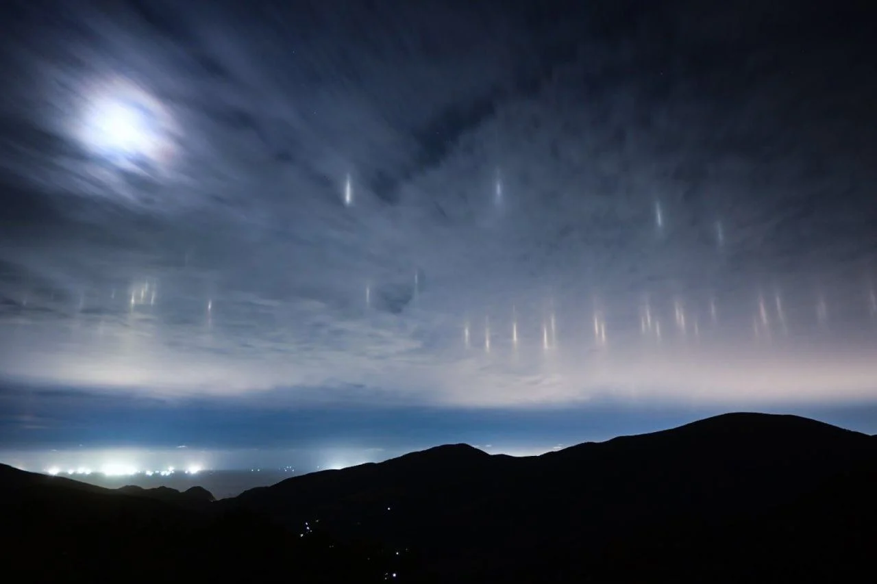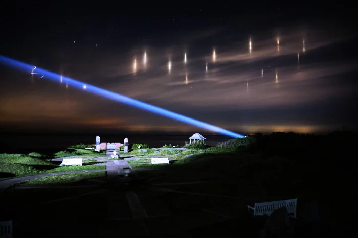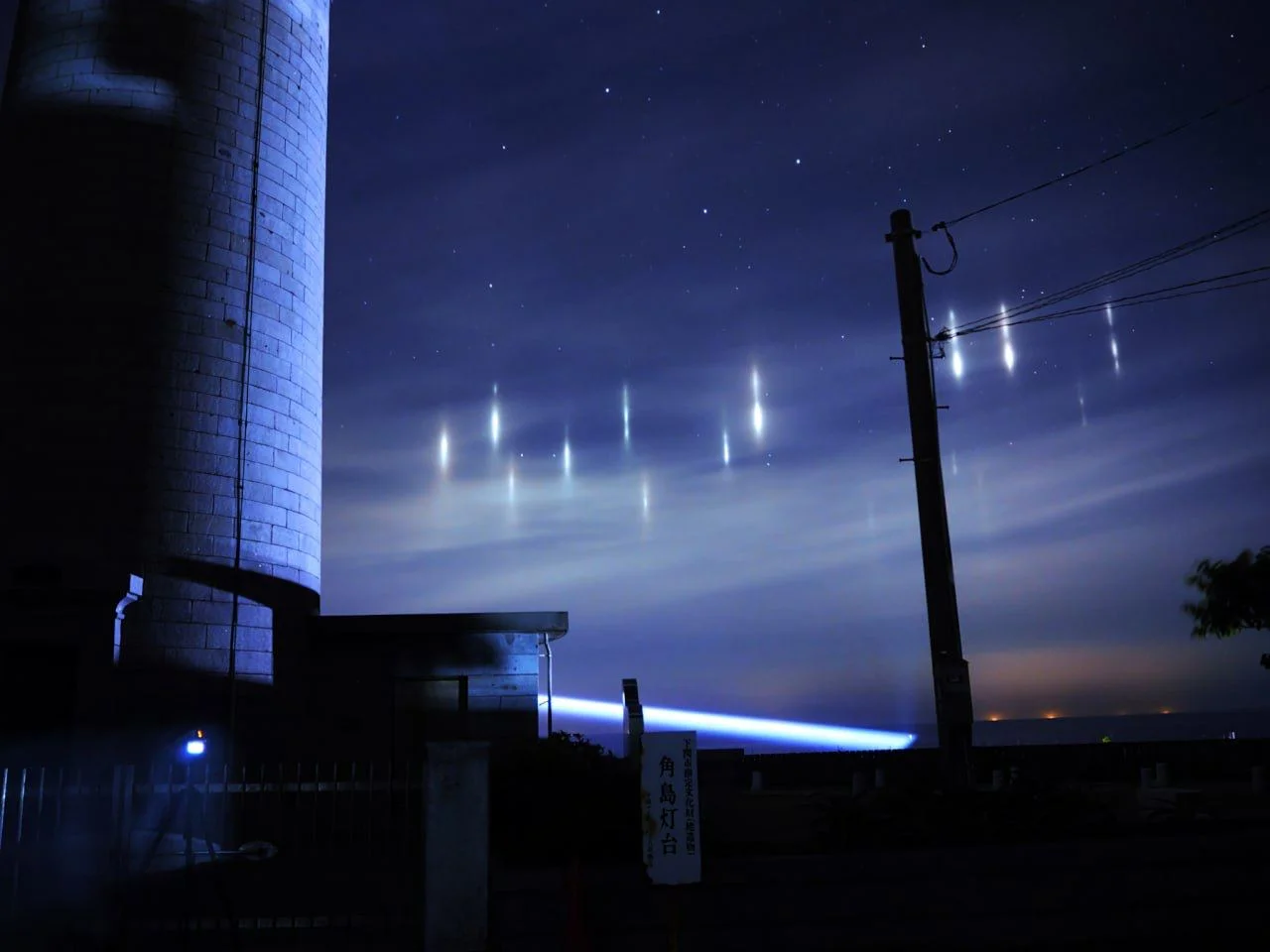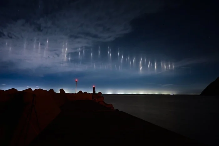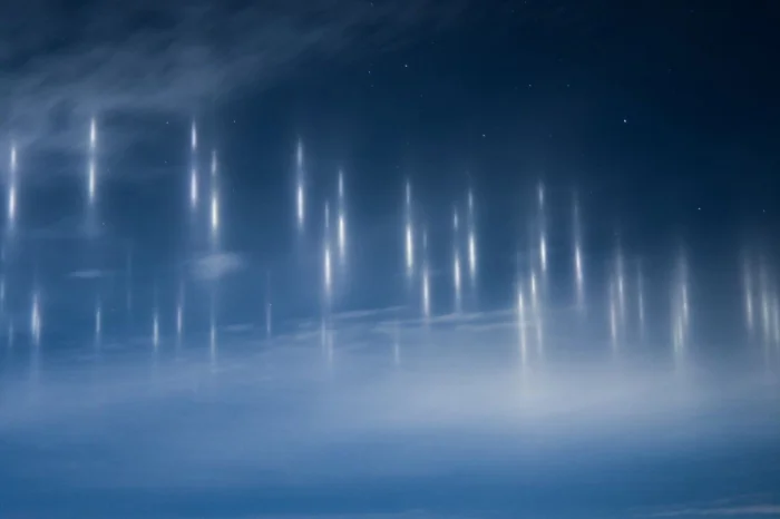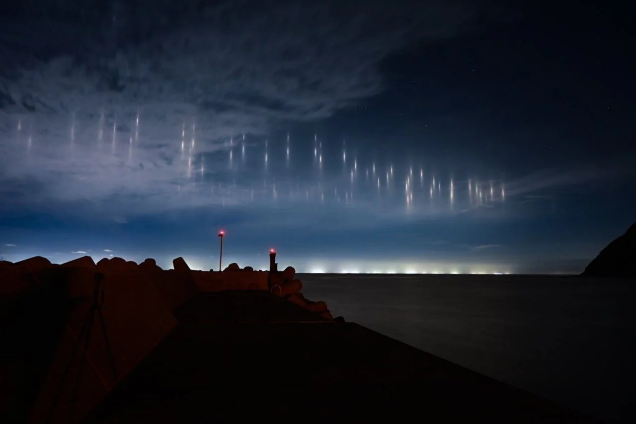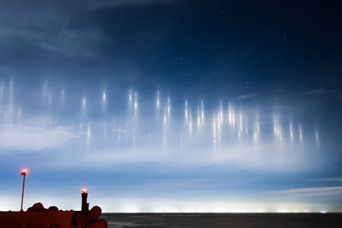 Такое явление встречается в прибрежных районах и объясняется очень просто. Эти столбы — свет фонарей рыболовных судов, отраженный кристалликами льда в прохладном ночном небе.