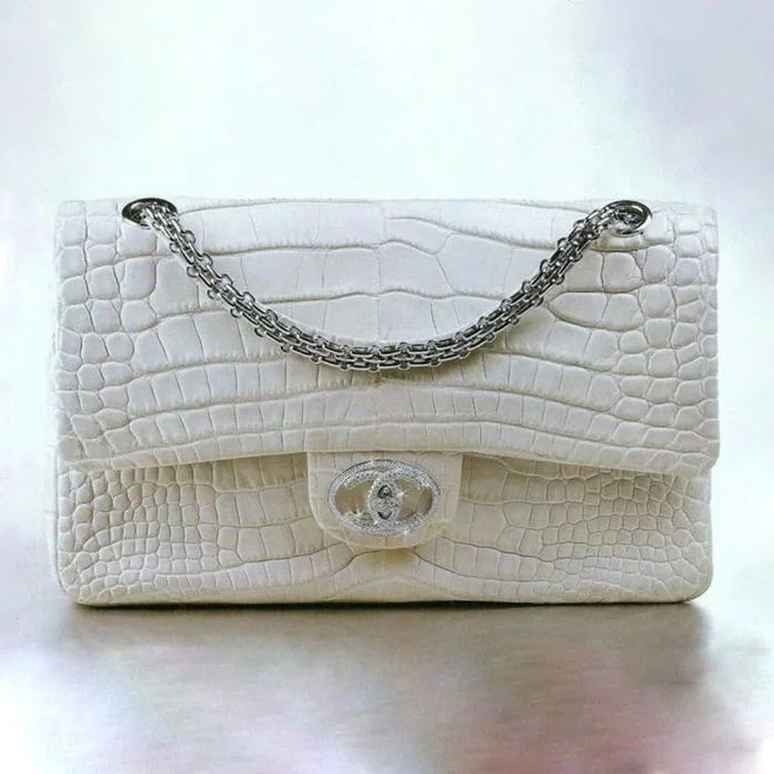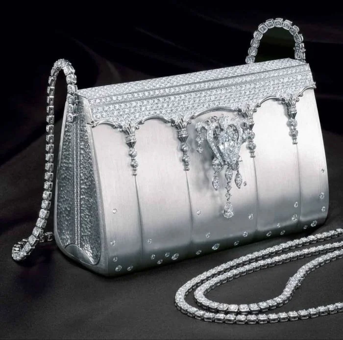 Сумка выполнена из платины и 2000 бриллиантов. Самый большой драгоценный камень, находящийся по центру аксессуара, имеет вес в 8 карат.