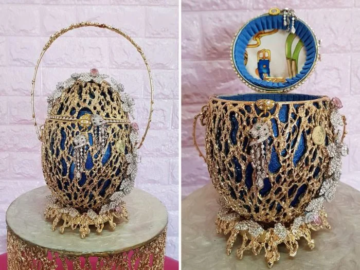Кошелек ручной работы сделан из скорлупы яйца страуса эму, переработанного шарфа Hermès, 8000 сверкающих бриллиантов и сережек Cartier, использованных в качестве застёжки.