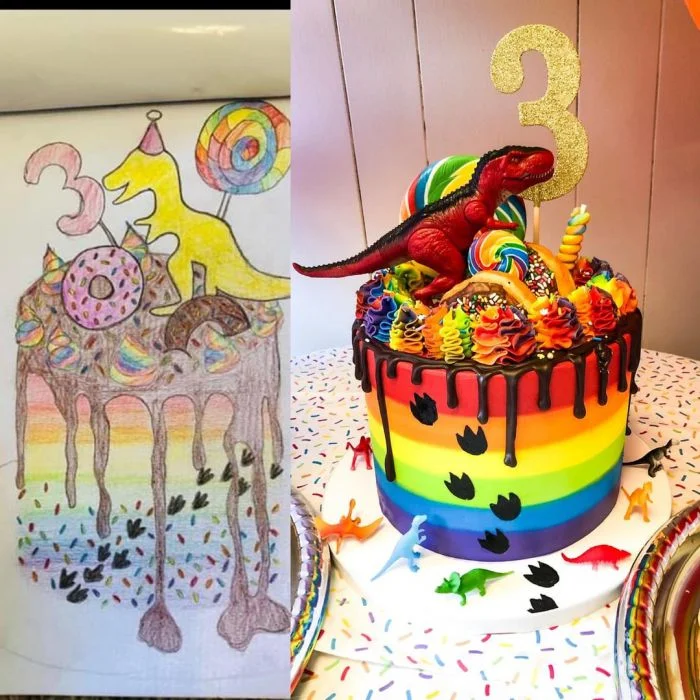 6. Вот что происходит, когда ваш трёхлетний ребенок приглашает вас на вечеринку с пирогом с динозаврами и радугой. Я нарисовала дизайн и заказала его у местного кондитера