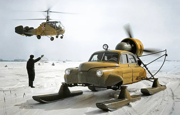 Вертолет КА–15 и аэросани на базе автомобиля ГАЗ–М–20 "Победа". Москва, Тушино, 1959 год.