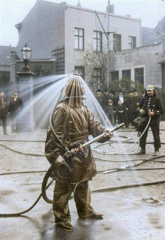 Публичная демонстрация пожарного шлема с водяным душем компании König в Гамбурге, Германия, 1900 год.