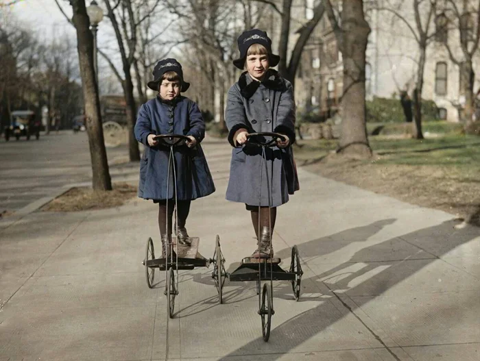 Дети Рита и Рут из датского посольства катаются по улицам Вашингтона на 3-колесных самокатах с ножным приводом, 1920 год.