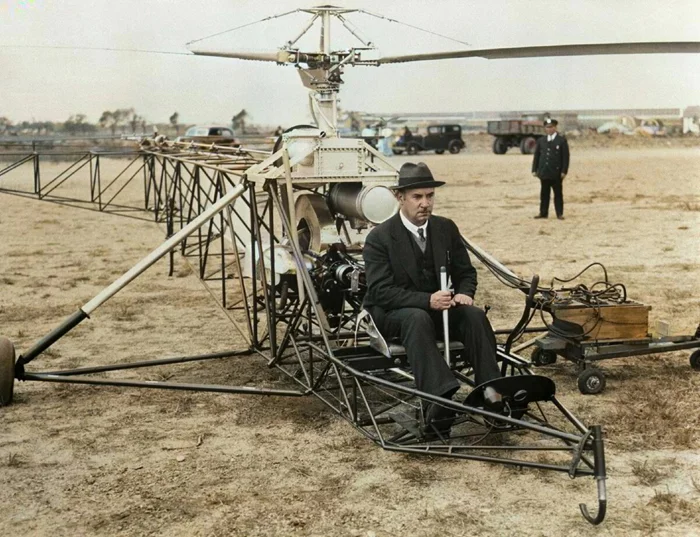 Русско-Американский авиаконструктор Игорь Сикорский готовится к полету на вертолете VS-300.