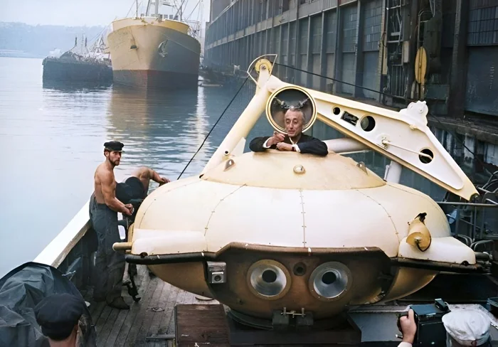 Жак-Ив Кусто в батискафе с пришвартованного в порту Нью-Йорка судна "Калипсо", 1 сентября 1959 года.