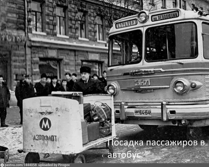 12. На площади Революции идёт посадка пассажиров в автобус-экспресс до аэропорта. Для багажа - специальная тележка.