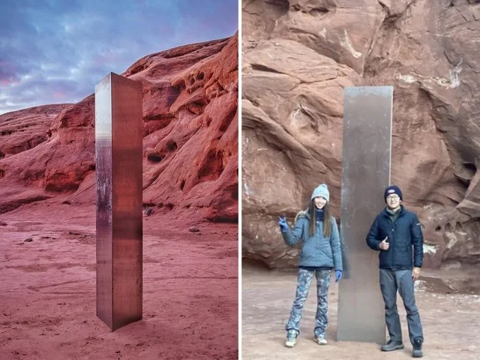 В пустыне штата Юта появилась крайне загадочная штука — сооружение из блестящего металла высотой в два человеческих роста. Скорее всего, её установил кто-то тайно. Сотрудники департамента общественной безопасности штата сочли нужным устранить объект, так как не понимали его назначения.Лишь некоторое время спустя музыкальная группа The Most Famous Artist призналась, что это они решили установить арт-объект. Теория о коварных пришельцах вновь провалилась!
