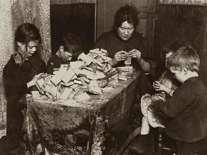 Семья собирает спичечные коробки для фабрики. Одна из самых низкооплачиваемых подработок в Лондоне. Фото сделано где-то в 1900-м году