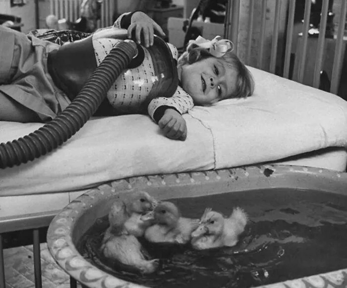 Больная полиомиелитом девочка Пегги Кеннеди наблюдает за уточками в ванночке, метод использовался в лечебных целях. 1956 г.