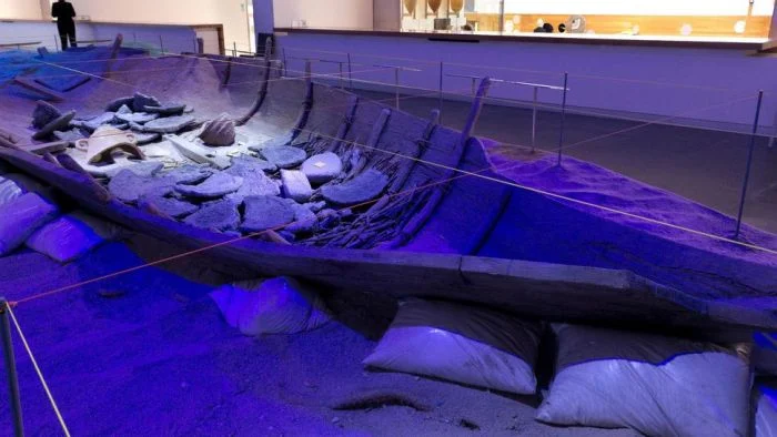 Римская империя контролировала огромную территорию, простиравшуюся от северной Англии до Сирии. Ее важнейшая граница проходила по центральной Европе, включая часть Германии. За прошедшие годы в этом регионе было обнаружено множество небольших кораблей, использовавшихся для перевозки войск. Представленный здесь образец датируется четвертым веком нашей эры и сделан из дуба. Это судно и другие найденные транспортники выставлены в Музее древнего мореплавания в Майнце, Германия.