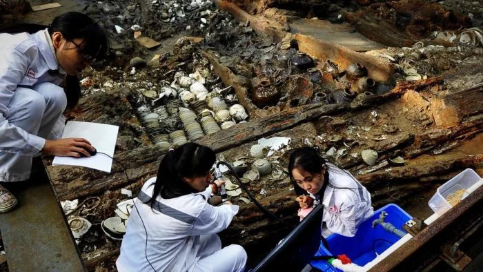 Длина затонувшего корабля Наньхай № 1, как его сейчас называют, составляет около 30 м, а ширина — 10 м. Возможно, он был построен во времена династии Южная Сун (1127—1279 гг. н. э.). Внутри было найдено около 60 000 артефактов, включая фарфоровые сосуды, железные изделия, медные монеты и медные кольца. Он был обнаружен на глубине около 25 м в 1987 году, но морские раскопки проводились только в 2007 году.
