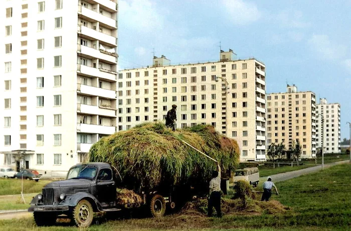 Во многих новых районах Москвы вплоть до 80-х годов работали коровники, возможно именно для них собирают сено.