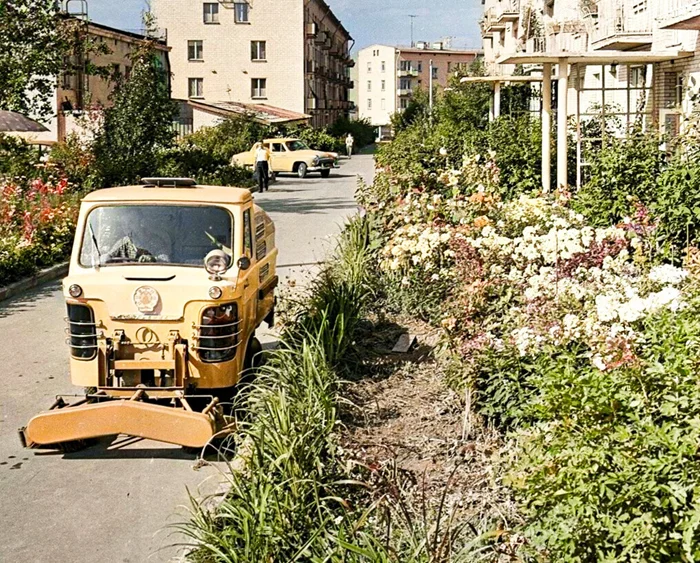 Универсальная уборочная машина на одной из улиц в 9-м квартале Новых Черёмушек, 1963 год.