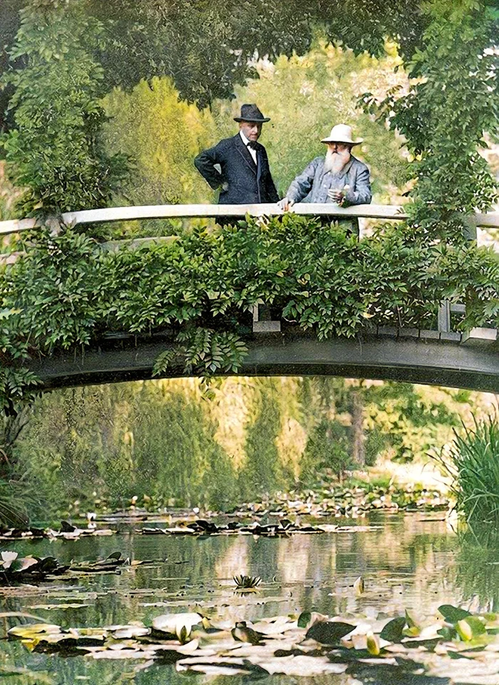Знаменитый французский художник-импрессионист Клод Моне стоит на мосту с посетителем в своем саду в Живерни.