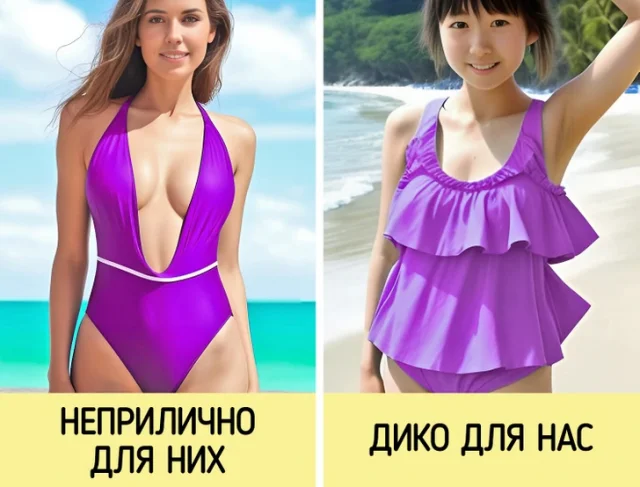 Обычные купальники в Японии считаются чересчур откровенными. Японки любят закрытые модели: с юбками, в виде сарафана или майки с шортами