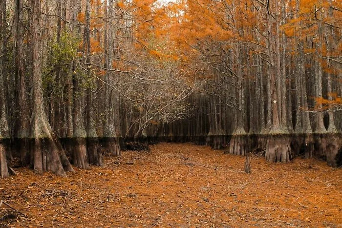 2. Деревья тупело (нисса) на высохшем болоте. Очень красиво, но жутковато. Национальный парк Джорджа Л. Смита, Джорджия, США