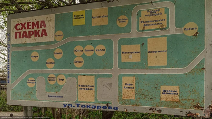Схема парка предвосхищает то, что ожидает нас внутри: веселые горки, юнга, колокольчик, орбита, солнышко и другие любимые аттракционы из детства. До сих пор не верится, что они сохранились… Ведь тридцать лет прошло, для подобного рода механизмов возраст очень солидный.