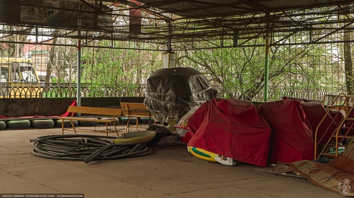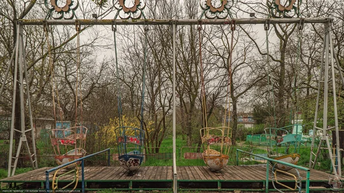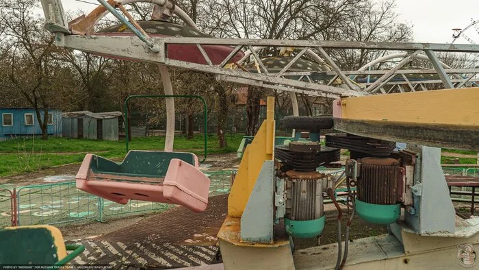 В глубине — позитивнее. Вот ожившим воспоминанием детства ржавеет аттракцион «Юнга». Перешагнув невысокий заборчик, я тщетно попытался разместится в кресле, в котором раньше можно было усесться вдвоём.