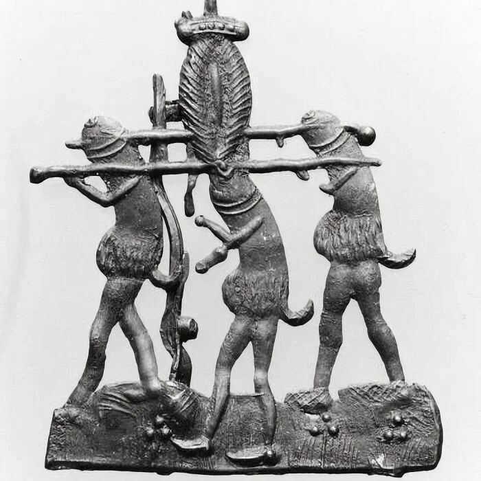 11. Средневековый значок паломника с изображением трех фаллосов, несущих коронованную вульву в процессии (1375-1450 гг.), найденный в Брюгге