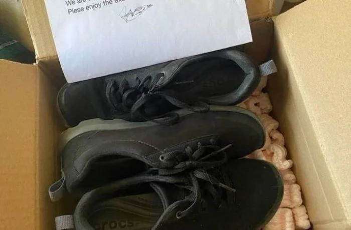"Моя мама заказала пару кроссовок на eBay. Они так и не пришли, и мы уже забыли о них, когда получили коробку. Внутри мы нашли записку с извинениями и третий ботинок в качестве компенсации"