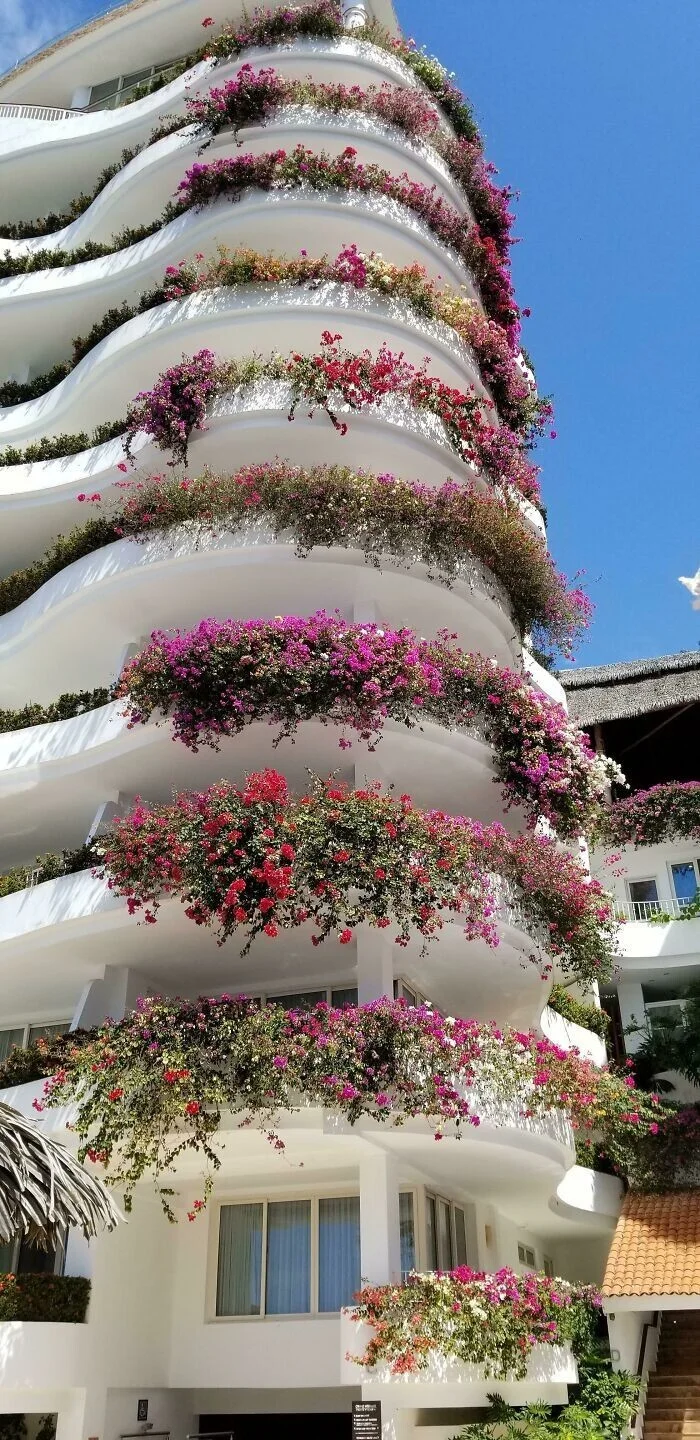 Бугенвиллии на балконах отеля в Пуэрто-Вальярта