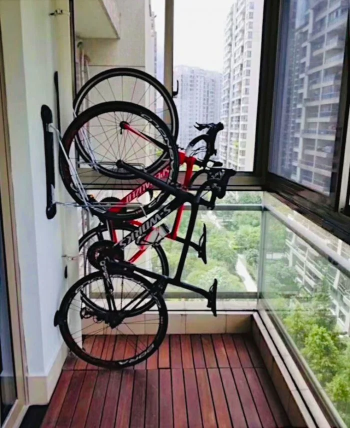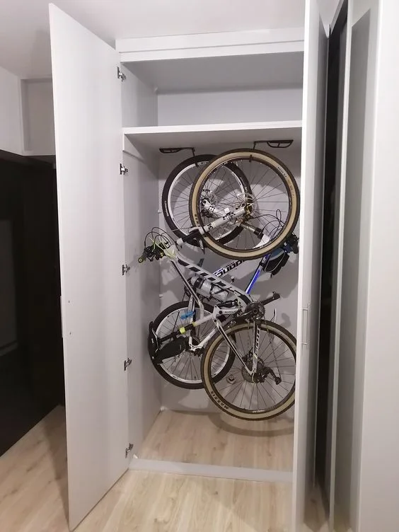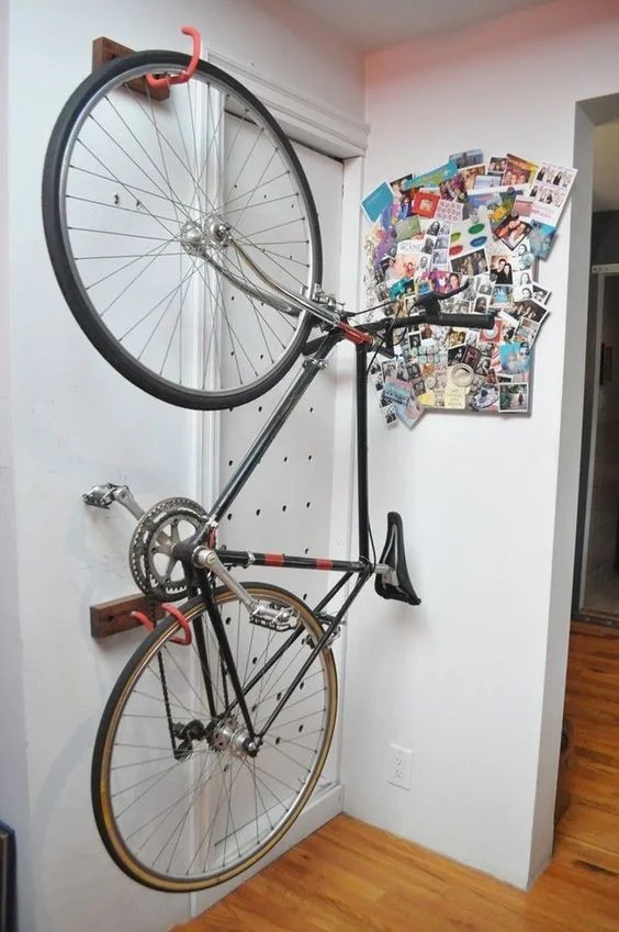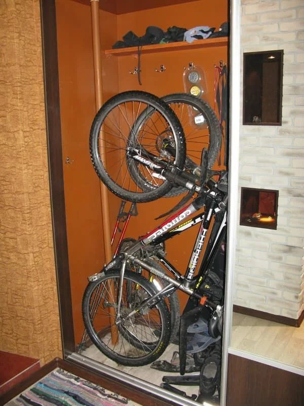 2. Но вот несколько советов, как обезопасить железного коня и удобно хранить в квартире: используйте настенные кронштейны, чтобы подвесить велосипед вертикально и сэкономить место на полу