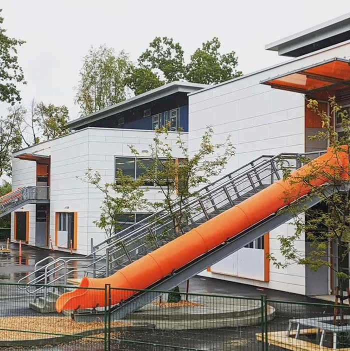 #9 Эта школа в Ванкувере, Британская Колумбия (Канада), установила горку, чтобы дети могли выходить из школы не по лестнице, а по ней.