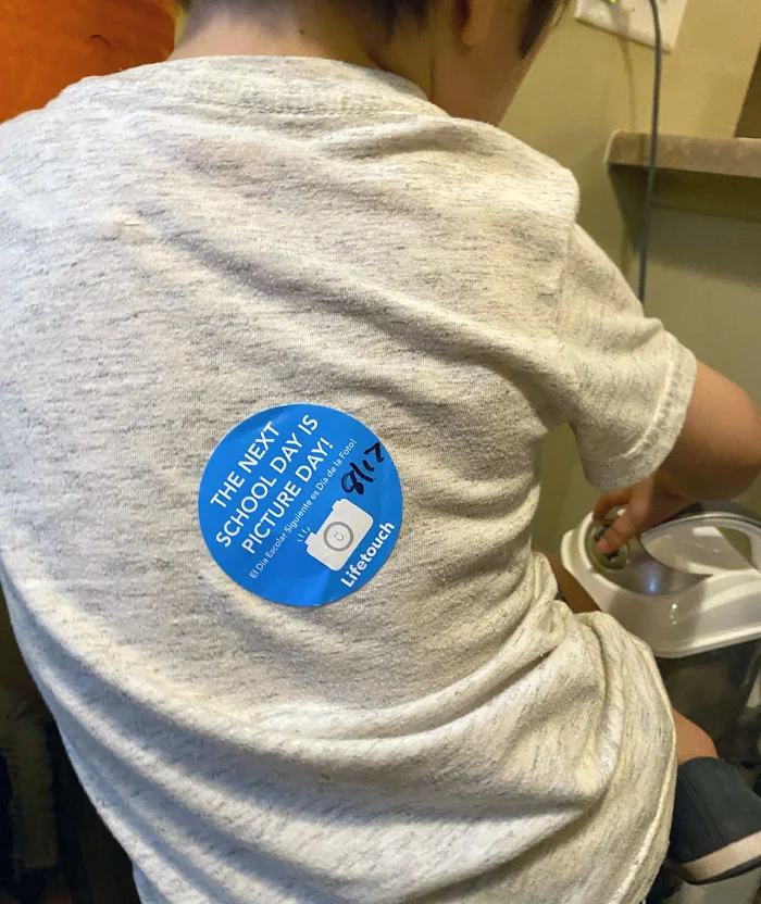 #27 Дошкольное учреждение приклеило наклейку-напоминание "День фотографии" на середину спины моего сына, чтобы он не мог ее снять