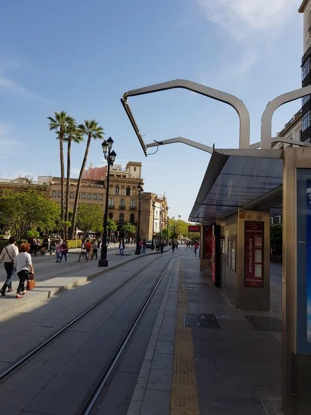 Трамваи в Севилье имеют аккумуляторы с быстрой зарядкой, поэтому им не нужны контактные сети вдоль пути