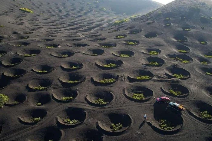 Виноградники, расположенные в луноподобных кратерах вулкана в Лансароте, Канарские острова