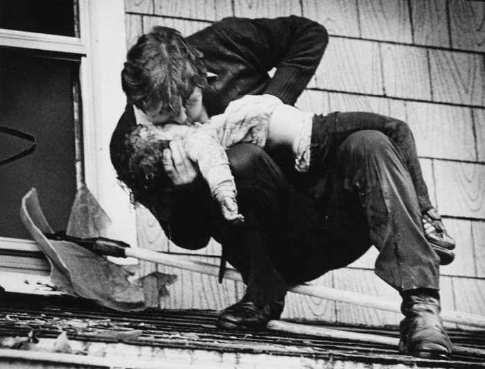 Пожарный делает искусственное дыхание трехлетнему ребенку, которого он спас из горящего дома. США, 1979 год