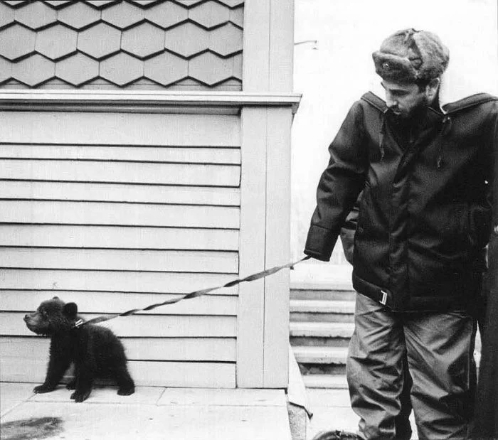 Фидель Кастро с медвежонком по имени Байкал, которого ему подарили сибирские геологи во время поездки в Советский Союз в 1963 году