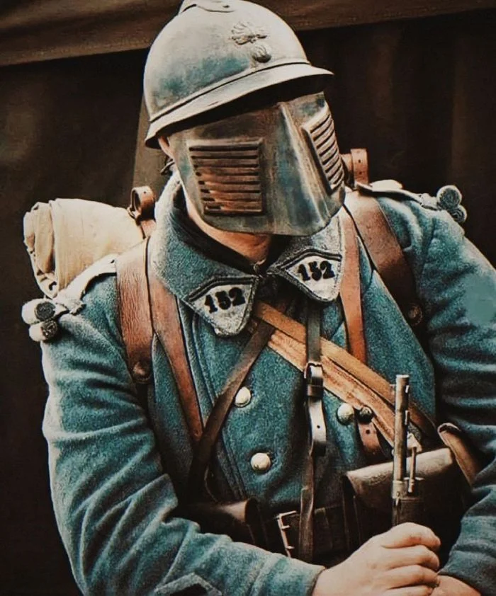 Французский пехотинец, использующий шлем с лицевым щитком, Первая мировая война