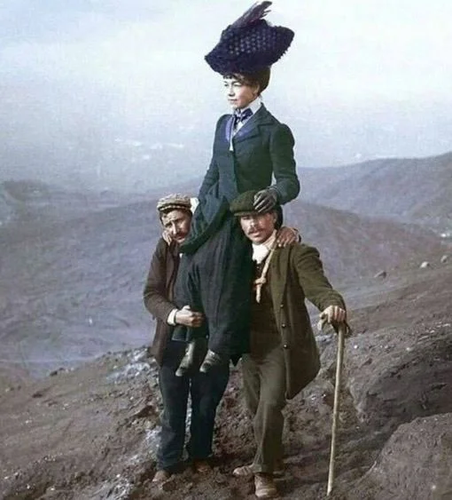 Горные гиды несут богатую дамочку, возжелавшую взойти на Везувий. 1910 год