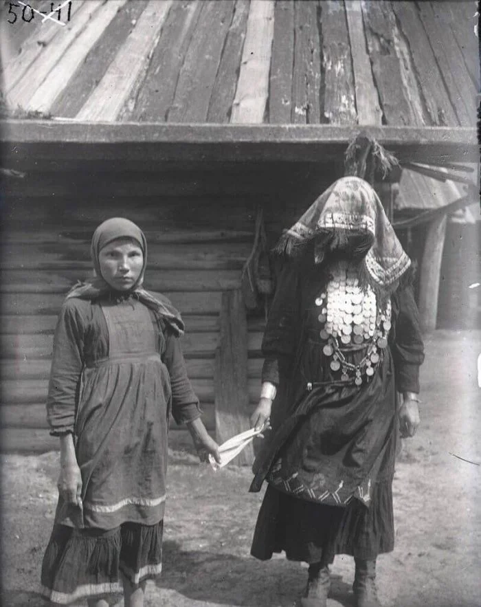 Сестра жениха ведет невесту за платок к реке для обливания водой по свадебному обряду, Удмуртия, 1930 год