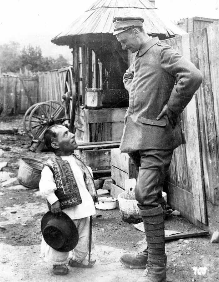 Немецкий солдат из альпийского корпуса ведет беседу с румынским крестьянином в Румынии в 1916 году, во время Первой мировой войны