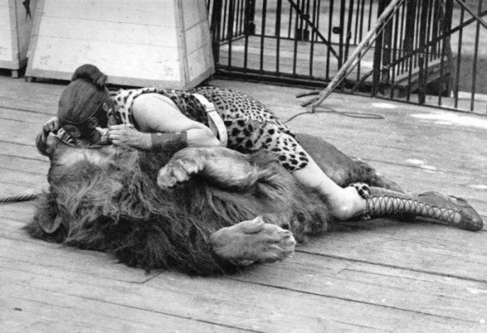 Дрессировщица в гладиаторском костюме засовывает голову в пасть льва, 1900 год