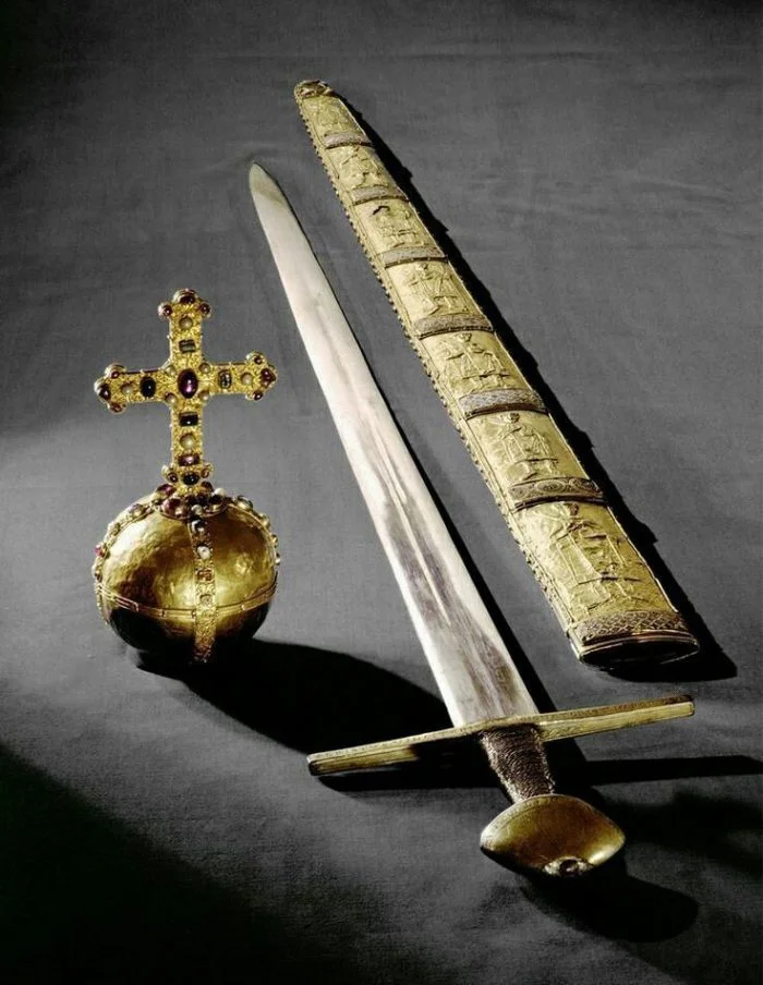 Меч, ножны и держава Священной Римской Империи. Меч и держава сделаны в Германии около 1200 года, ножны с портретами императоров от Карла Великого до Генриха III - в Италии во второй половине XI в.