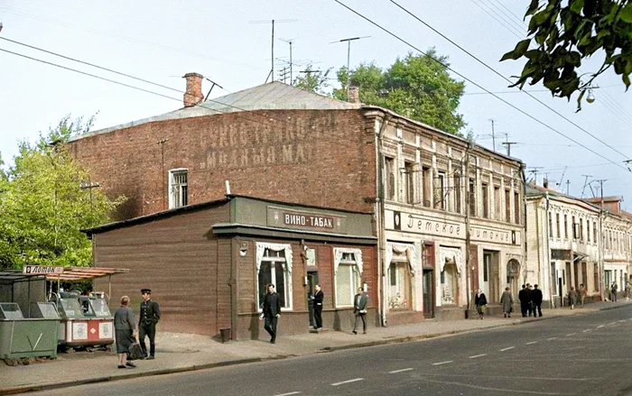 На здании видна дореволюционная реклама, которая проглядывает на кирпичной стене.