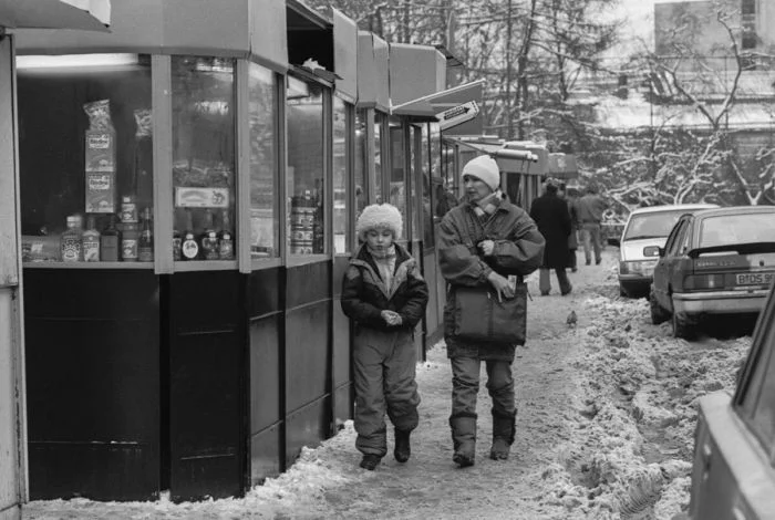29. Мама с сыном идут вдоль рядов коммерческих палаток на Пушкинской, Москва, 1993 год