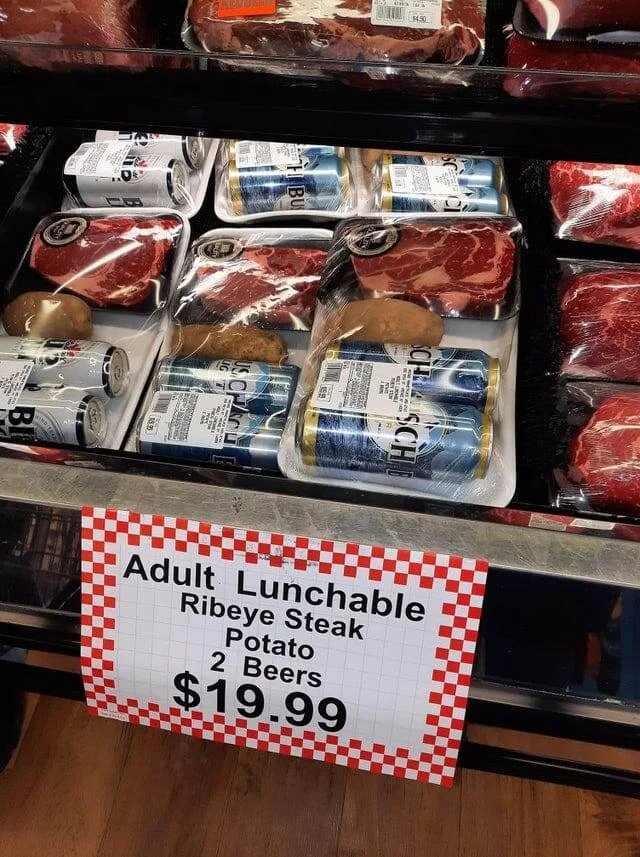 Обед для взрослых. Включает в себя две банки пива, картофелину и большой стейк
