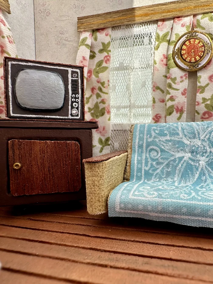 Сама мебель выполнена по личным фотографиям и картинкам из интернета (если на фото не видно этот предмет). Это все ручная работа. Кое-что было напечатано на принтере: иконы заказчика, фотография на трюмо, часы на кухне и над диваном, картина, ковер с оленями (это уже печать на ткани).