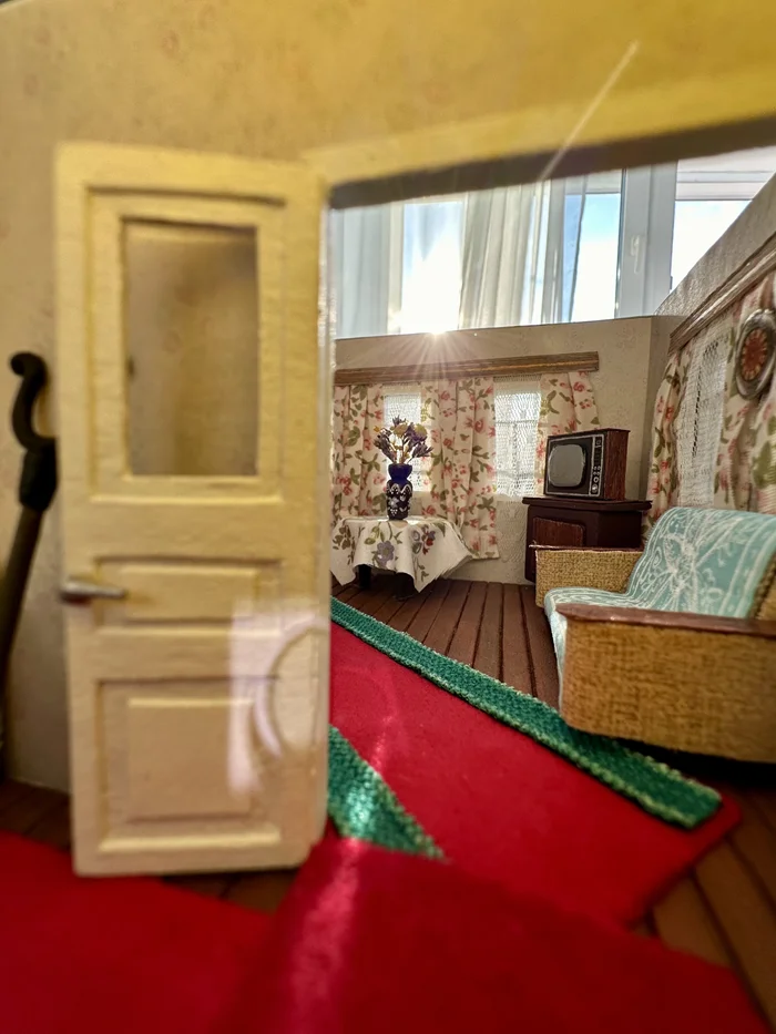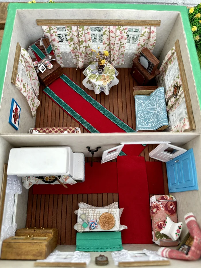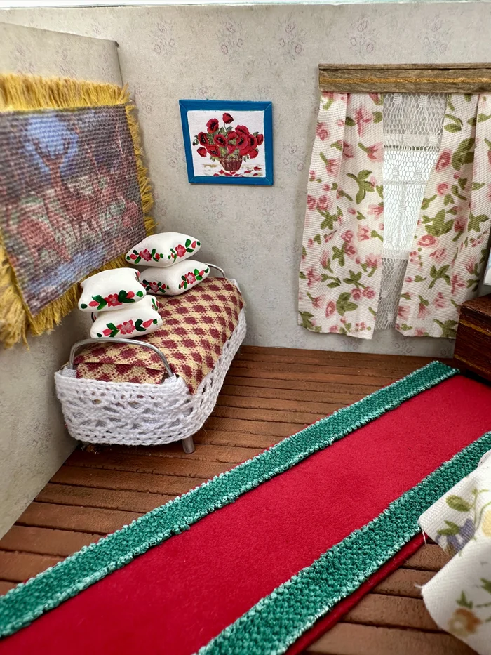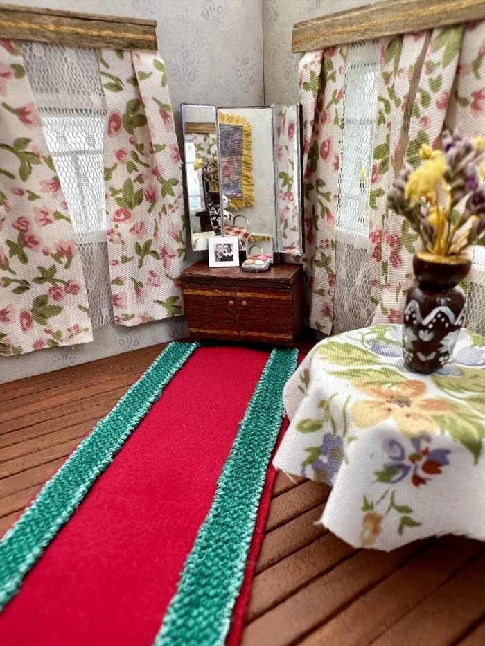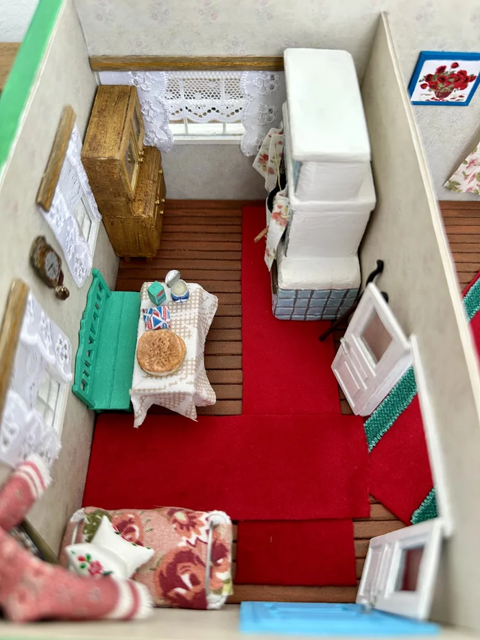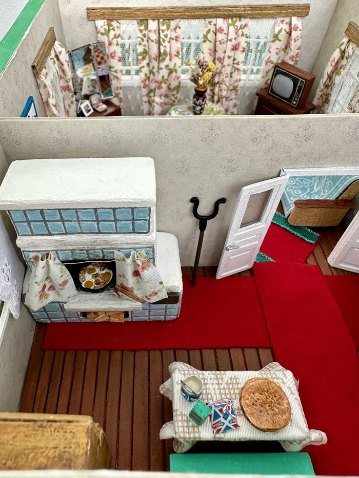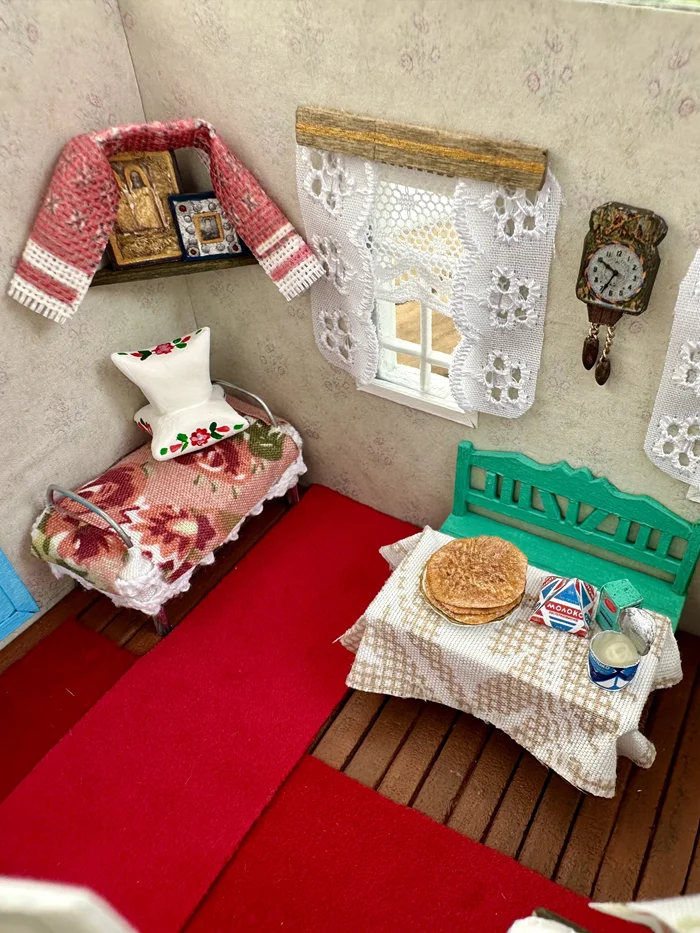 Внутреннее убранство дома - это собирательный образ оригинала. К сожалению, в маленький домик невозможно поместить все комнаты и всю мебель, иначе он перестанет быть маленьким и поставить его можно будет разве что на кухонный стол)) Поэтому, заказчик выбрал наиболее памятные предметы мебели, которые мы разместили примерно также, как было раньше.