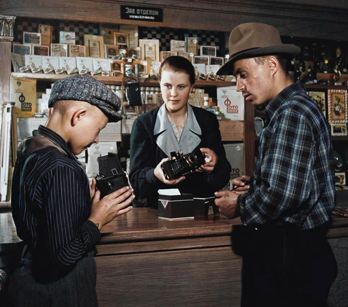 На фотографии отец покупает сыну фотокамеру "Любитель". Он выпускался в 1950-е годы на Ленинградском оптико-механическом заводе. Копия этого фотоаппарата продавалась в Китае.