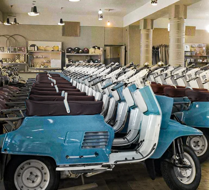 На фотографии отдел спортивных товаров и мотороллеры "Вятка" В150М выставленные в ряд. Выпускались такие с 1967 по 1974 год на Вятско-Полянском машиностроительном заводе. Являлись копией итальянского мотороллера «Веспа» 150GS, 1955 года выпуска.