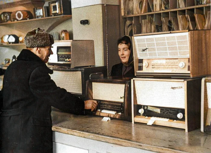 Справа интересная секция, видимо для грампластинок, а слева отдел с оружием. На прилавке мы видим телевизор "Рекорд" 1956 года выпуска, на полке телевизор "Енисей", выше - два граммофона.